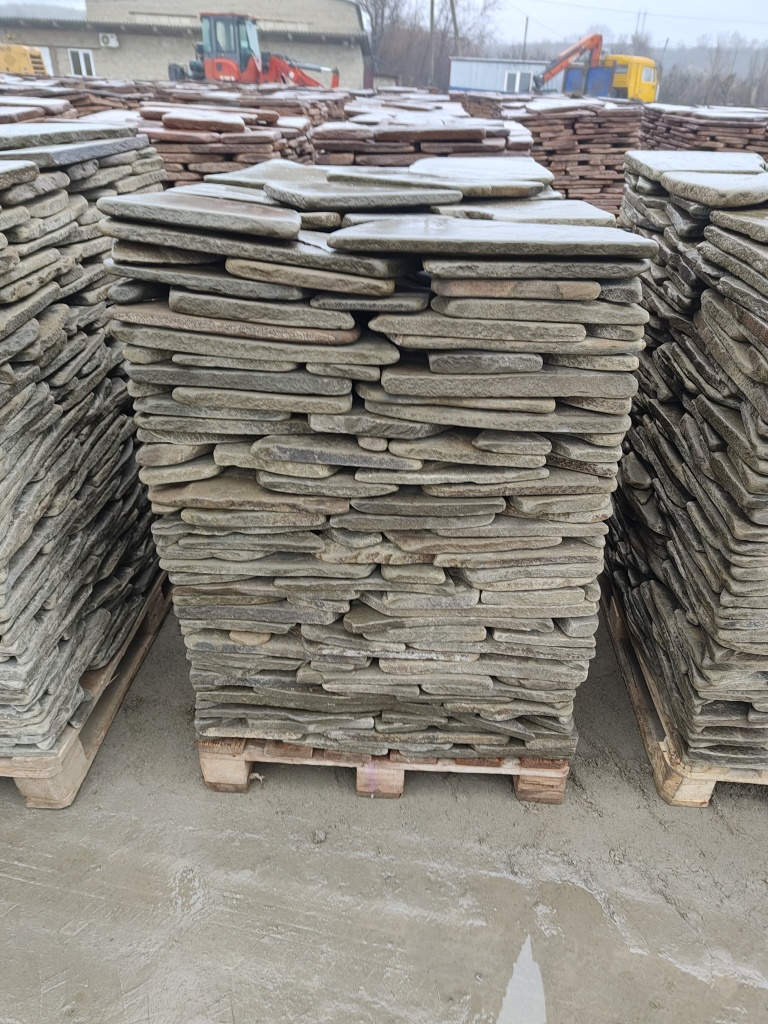 Галтованный серо-зелёный песчаник для мощения дорожек, пешеходных зон, тротуаров на землю, грунт, песчано-щебёночную подушку.